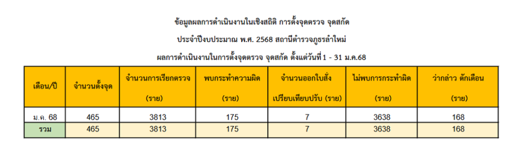 ข้อมูลผลการดำเนินงานในเชิงสถิติ การตั้งจุดตรวจ จุดสกัด เดือน ตุลาคม 2567
