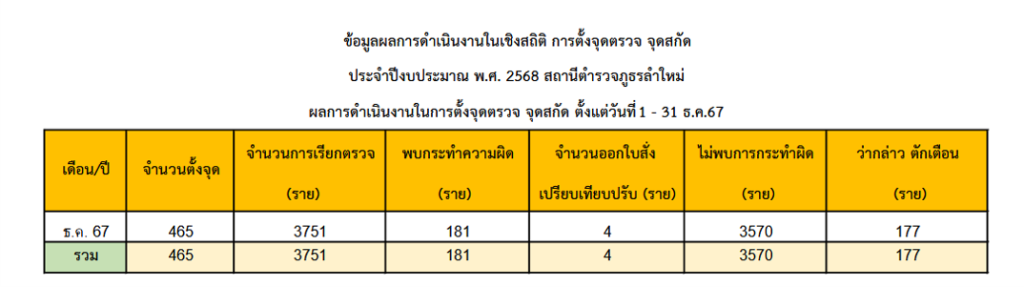 ข้อมูลผลการดำเนินงานในเชิงสถิติ การตั้งจุดตรวจ จุดสกัด เดือน ธันวาคม 2567