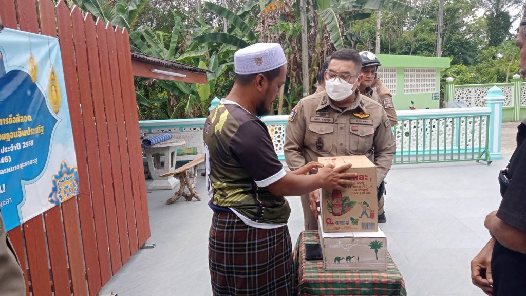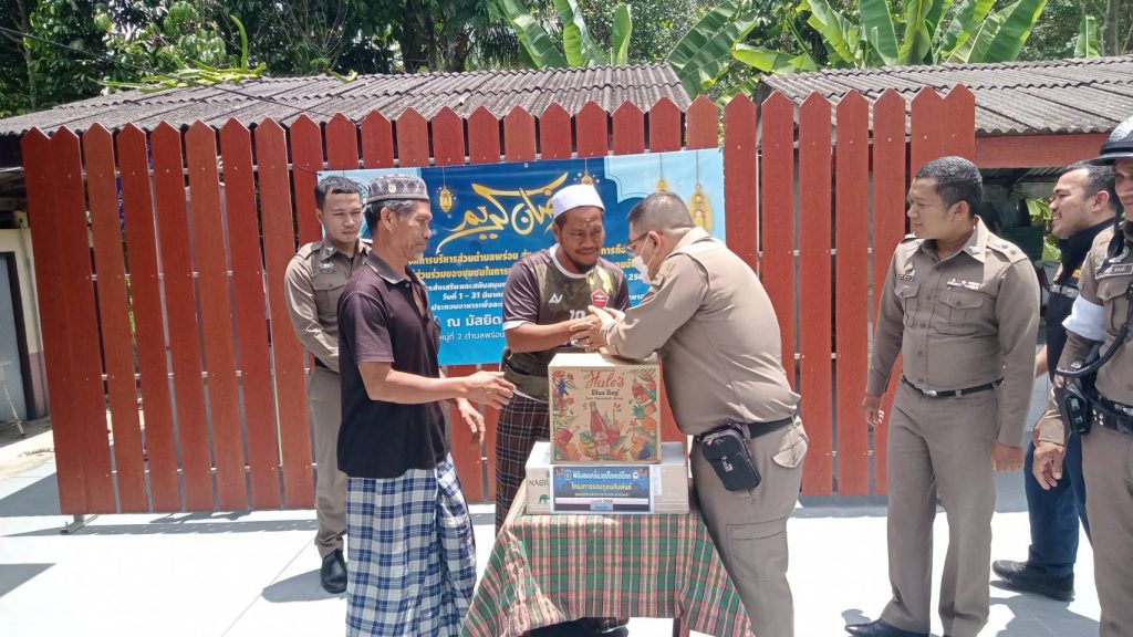 วันที่ 171210 มี.ค.2568 ว่าที่ พ.ต.อ.โฆษิต เบญจกุลผกก.สภ.ลำใหม่,พ.ต.ท.สุชาติ ชูกะชะบา รอง ผกก.(สอบสวน) สภ.ลำใหม่ พร้อม ชุด ตชส.สภ.ลำใหม่ ได้พบปะพูดคุยกับผู้นำศาสนาและประชาชนในพื้นที่ เนื่องในช่วงเดือนรอมฎอนพร้อมได้มอบอินทผาลัมเพื่อเป็นขวัญกำลังใจในการปฏิบัติศาสนกิจณ มัสยิดยาแมะ ม.2 ต.พร่อน อ.เมืองยะลา จว.ยะลา